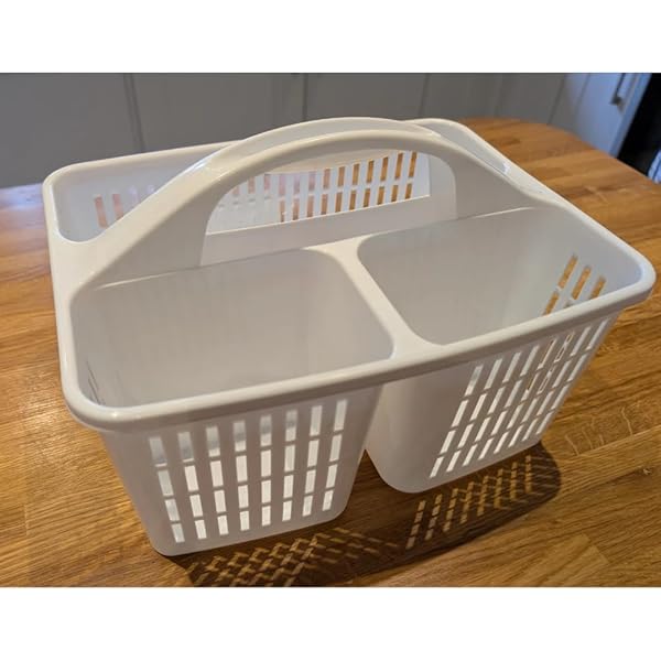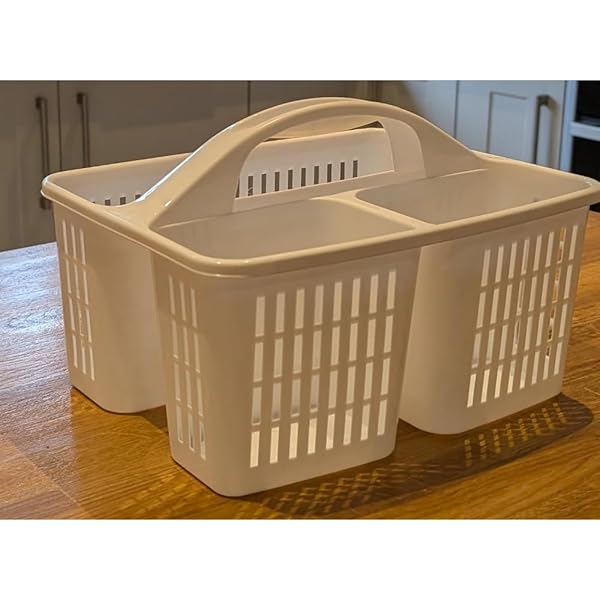 This plastic kitchen caddy is the perfect solution for keeping your cleaning supplies organized. The handle makes it easy to carry, while the spacious basket can hold cleaners, sponges, and utensils. It features a white, durable plastic carry handle and 3 compartments.